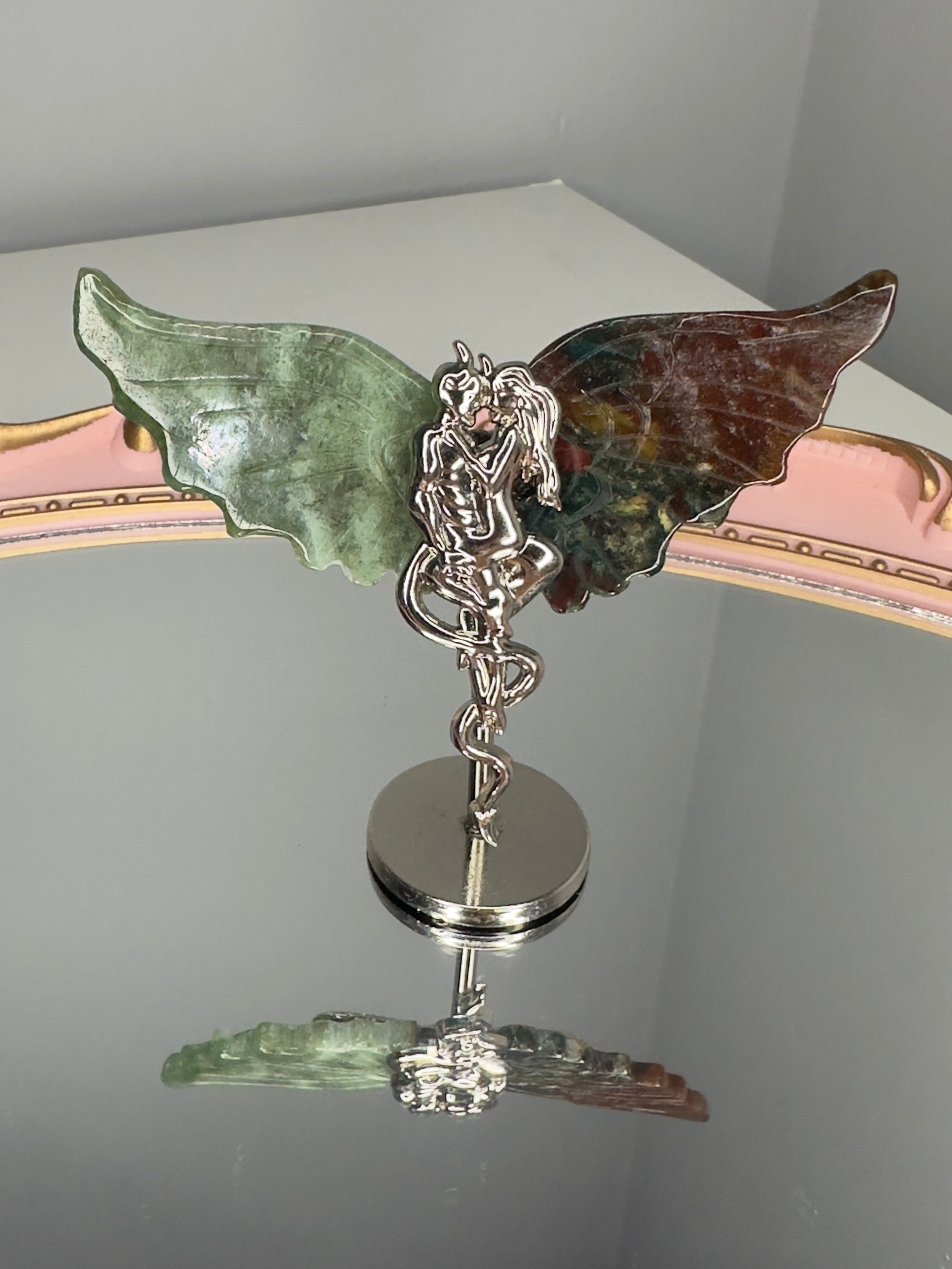This angel and demon stand brings together the grounding beauty of moss agate and the soothing energy of ocean jasper. One wing is carved from moss agate, a crystal known for its deep connection to nature and emotional balance. The other wing is made from ocean jasper, a stone of comfort, renewal and gentle calm.