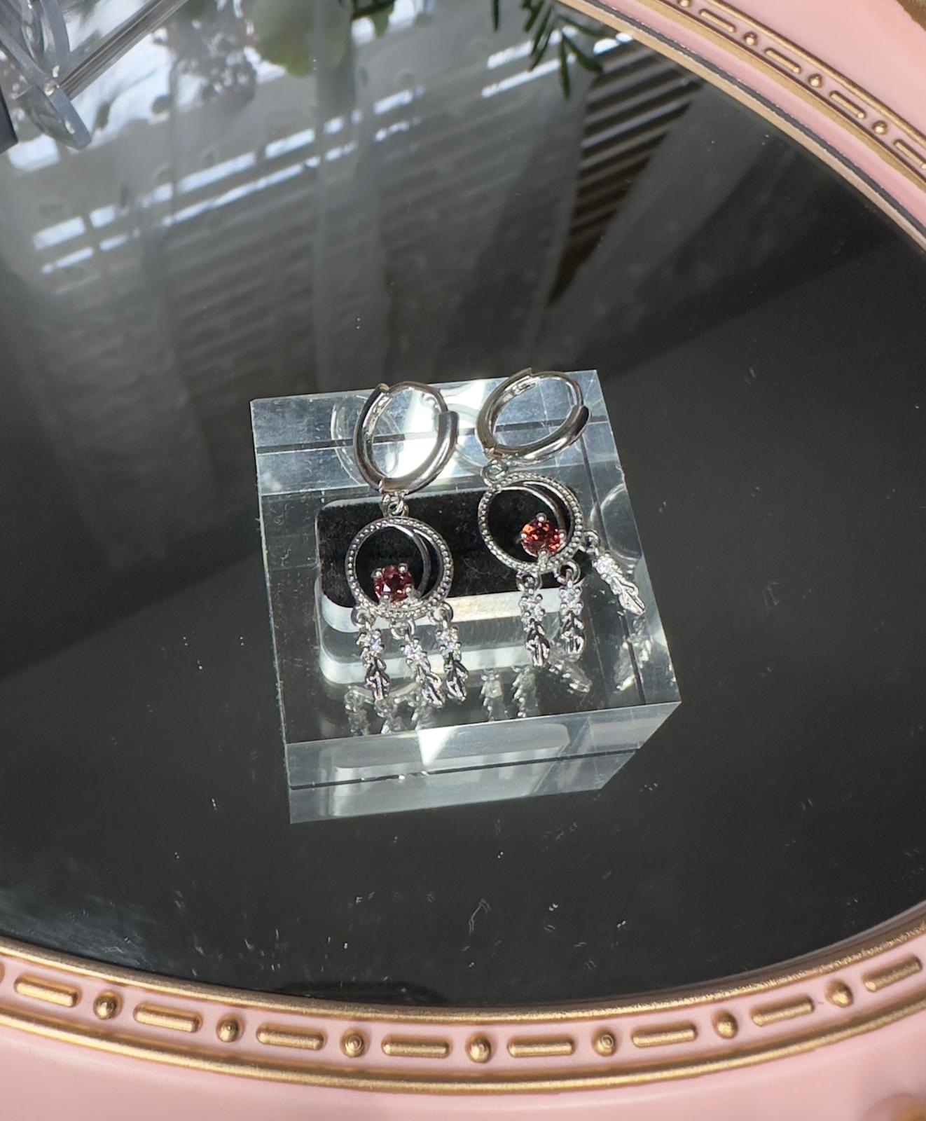 These striking earrings feature deep red garnet gemstones set in sterling silver, accented with sparkling details and flowing dangles for graceful movement.