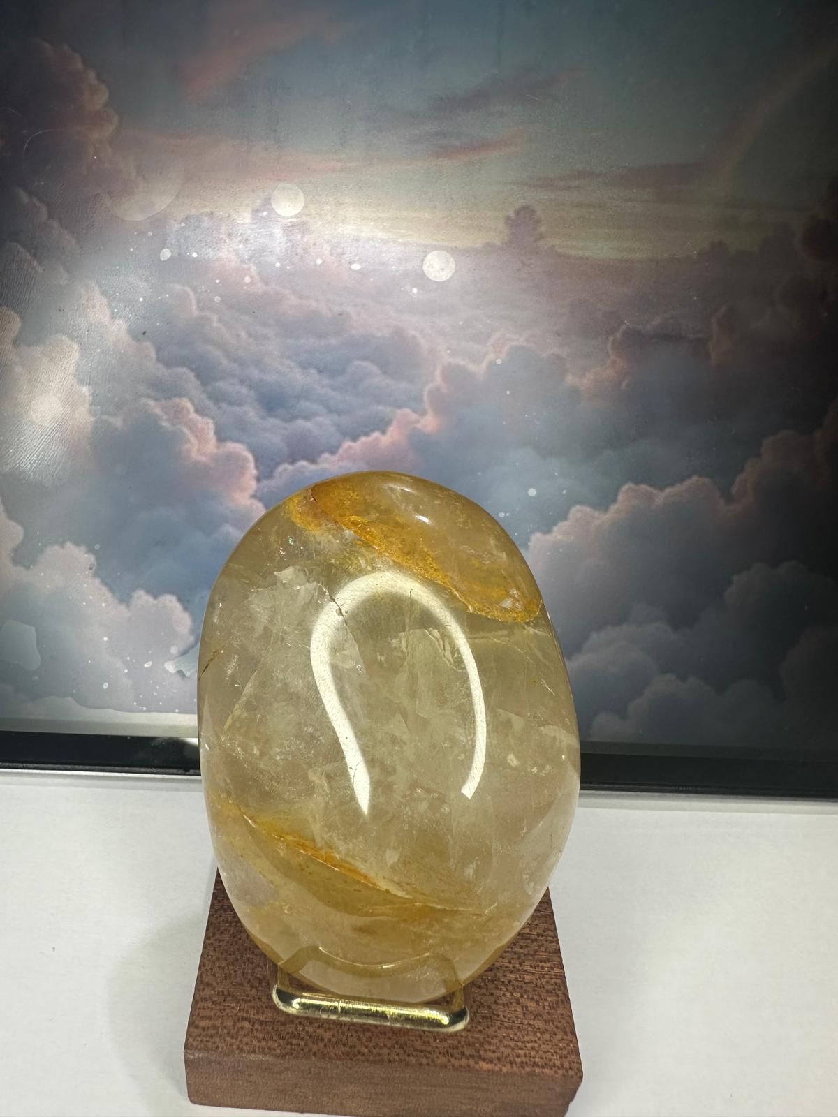 Golden Healer palm stones are polished from high quality quartz with natural golden iron oxide inclusions running through the crystal. Each piece carries its own unique pattern of warm golden streaks, soft translucency and internal markings, making every stone one of a kind.