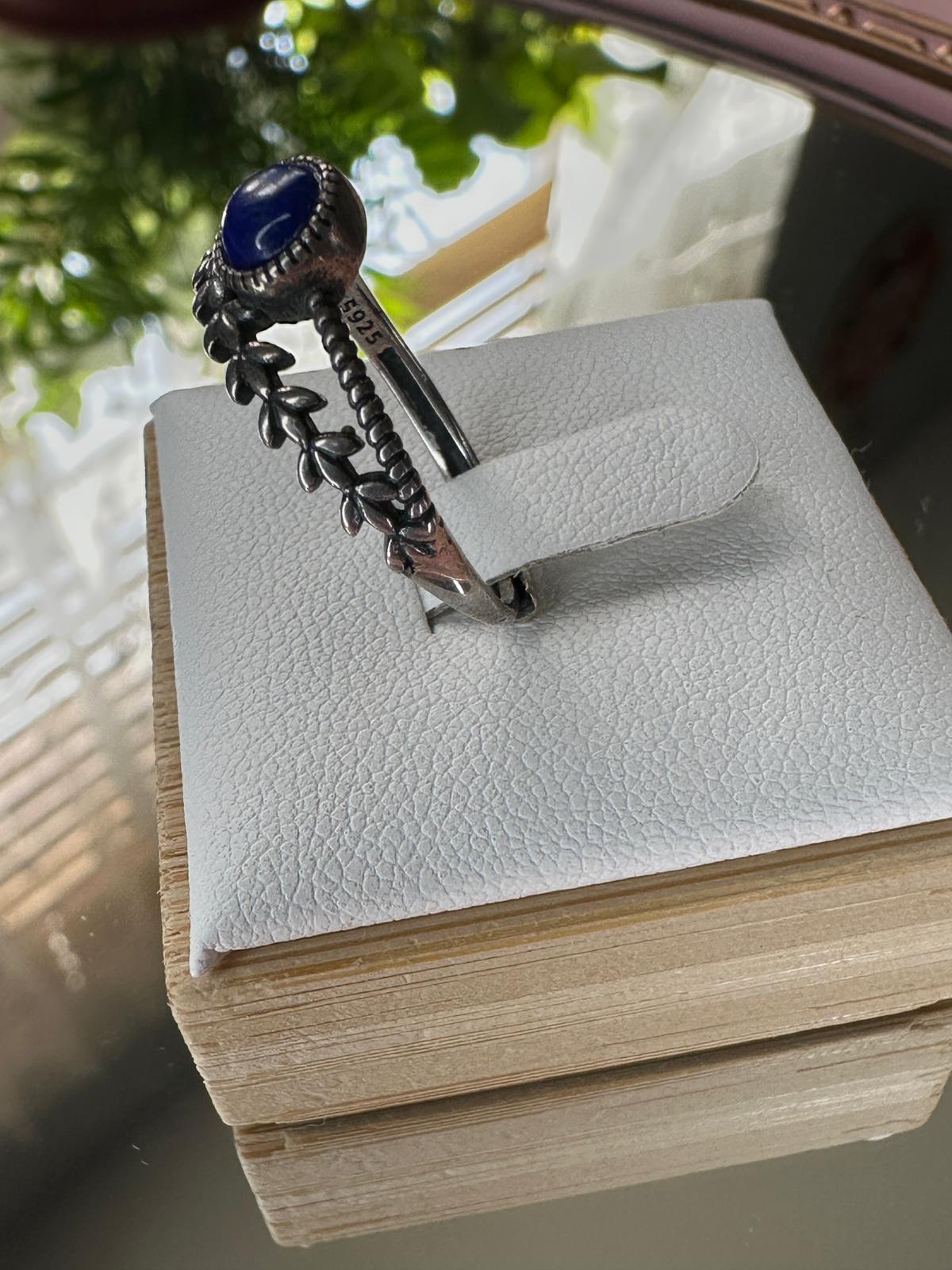 A deep blue lapis lazuli gemstone set in sterling silver, framed by a detailed leafy band for a natural, bohemian touch. Lapis Lazuli is the stone of wisdom and truth, enhancing clarity, inner vision, and self-expression. With its rich colour and adjustable design, this ring is both grounding and empowering.
