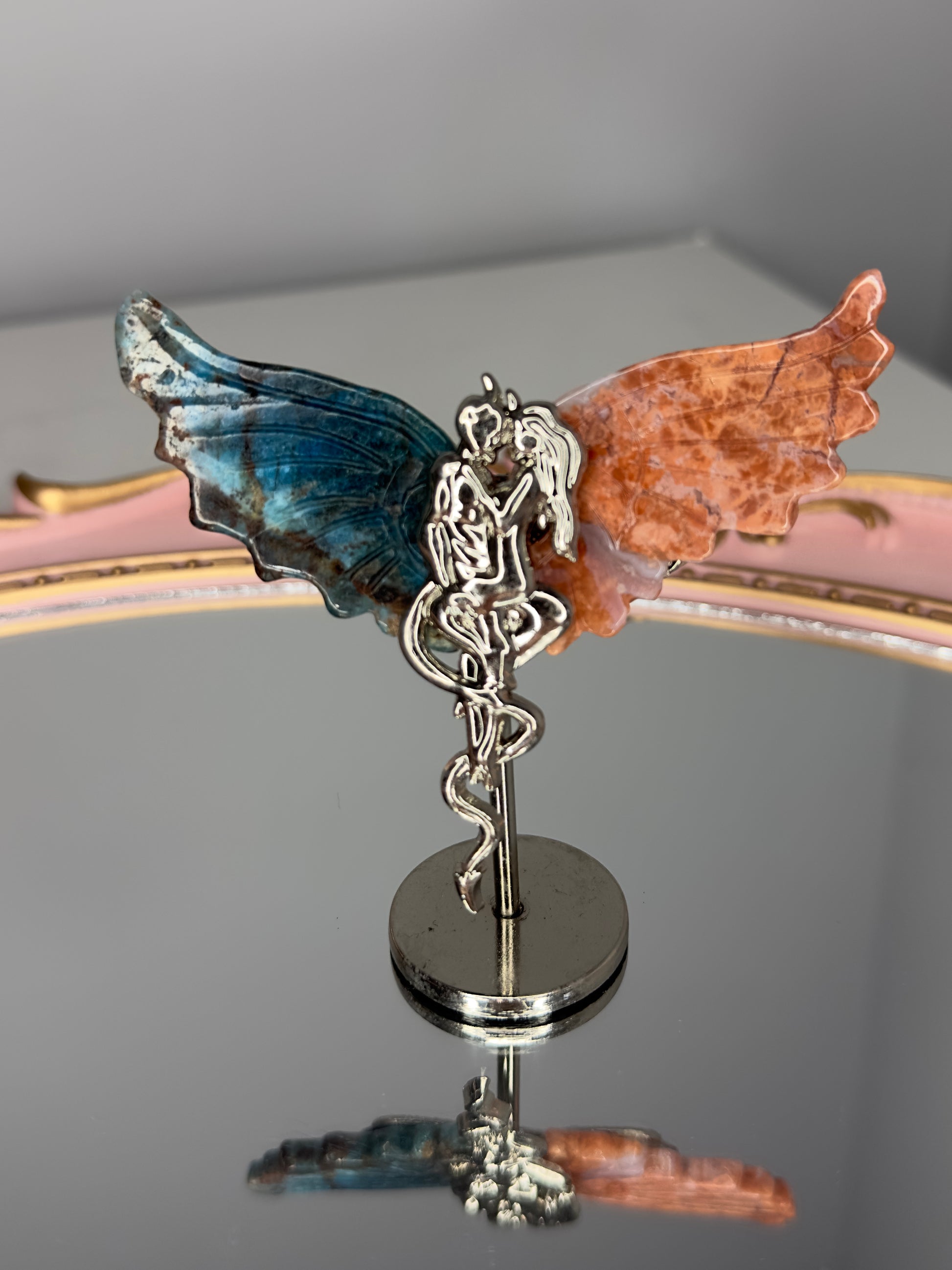 This angel and demon stand brings together two powerful and visually striking crystals. One wing is carved from blue apatite, a stone known for clarity, confidence and inner truth. The other wing is carved from pink agate, which is gentle, nurturing and emotionally soothing. The contrast between the cool blue and the warm pink creates a beautiful harmony of energy and colour